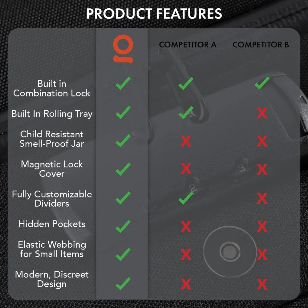 See 9.5x7.5x3 tolline suur karp on suurepärane lahendus kõigi teie tarvikute märkamatuks hoiustamiseks! See on varustatud erinevate varjatud taskutega, suure lukuga taskuga, teisaldatava kandikuga, paindliku võrguga väikeste esemete hoiustamiseks ja täielikult ühilduvate värvikoodiga takjakinnitustega. Nii saate oma hoiustamist kohandada, et see sobiks teie esemetele kõige paremini!