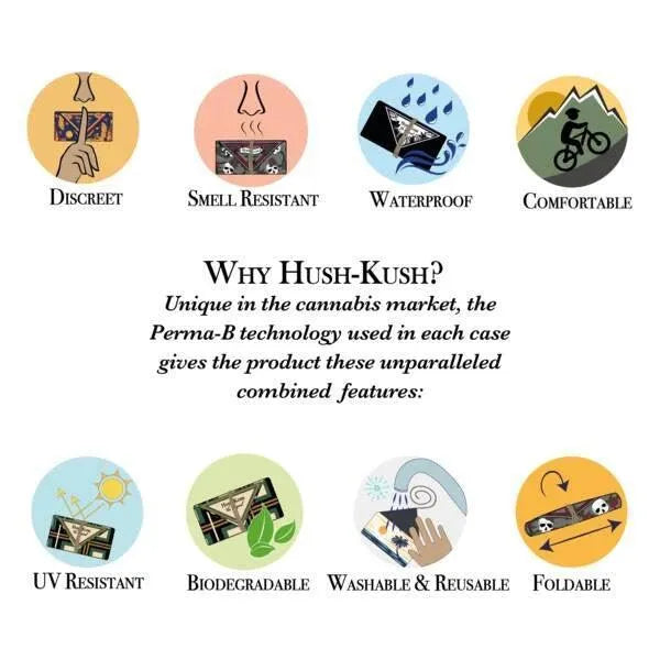 Hush Kush kotid pakuvad ideaalset hoiustamis- ja transpordivõimalust teie valmis keeratud spliffidele ja ürtidele. Mitmekülgsed Hush Kush kotid on ruudukujulised, kuid neid saab voltida vastavalt soovile. Need on valmistatud keskkonnasõbralikust, biolagunevast materjalist, mis on kerge, lõhnakindel ja veekindel ning viimistletud loodusliku mesilasvahapõhise Perma-B tehnoloogiaga.