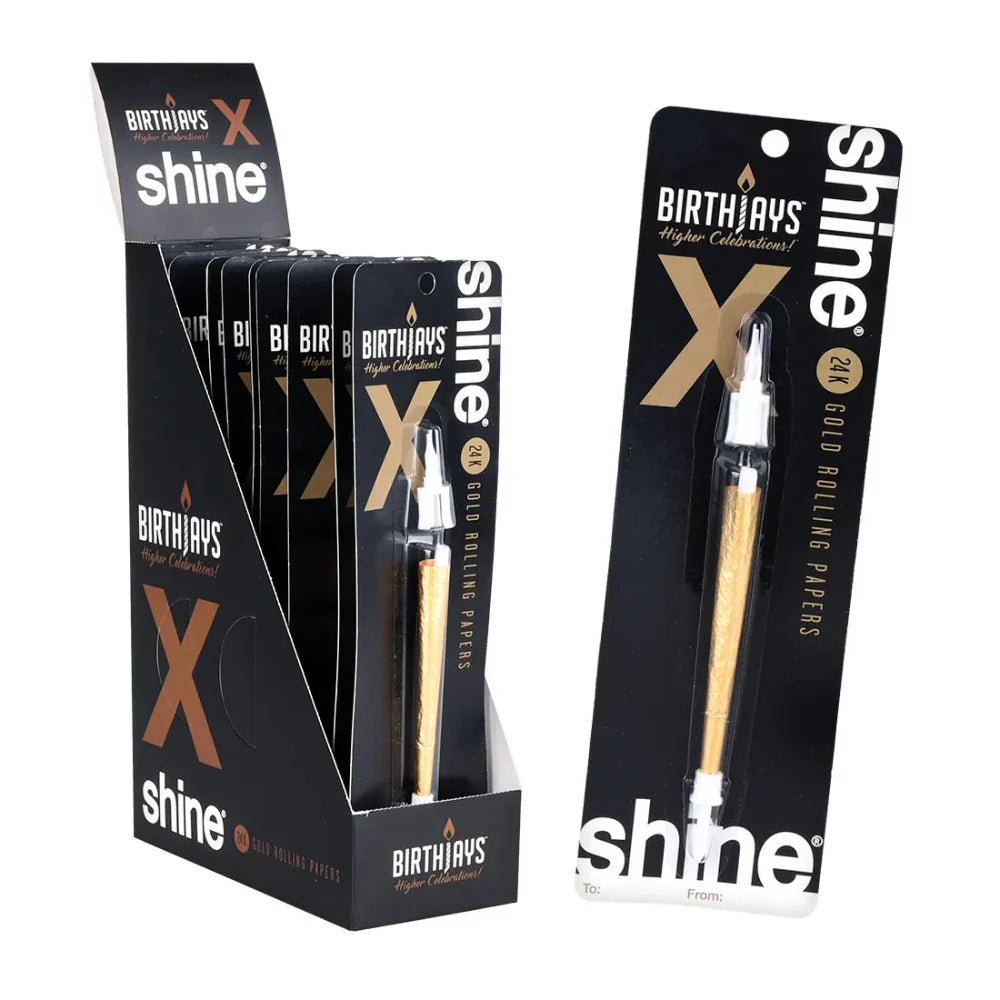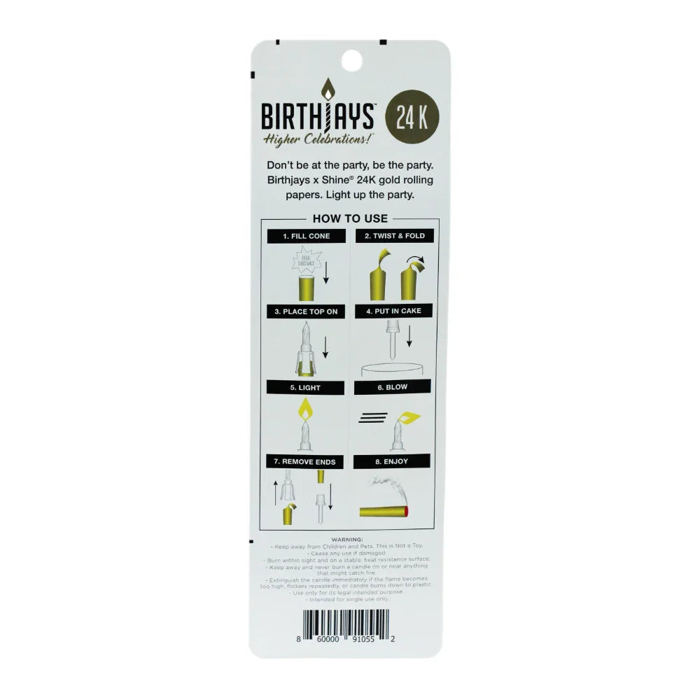 The Shine 24K Gold BirthJay Cone is a premium, pre-rolled cone made from real 24K edible gold rolling paper. It includes a removable cake stake and candle topper, making it a standout accessory for birthdays, parties, and celebrations. Designed by Shine, this cone offers a luxurious smoking experience for adults who enjoy quality and creativity.