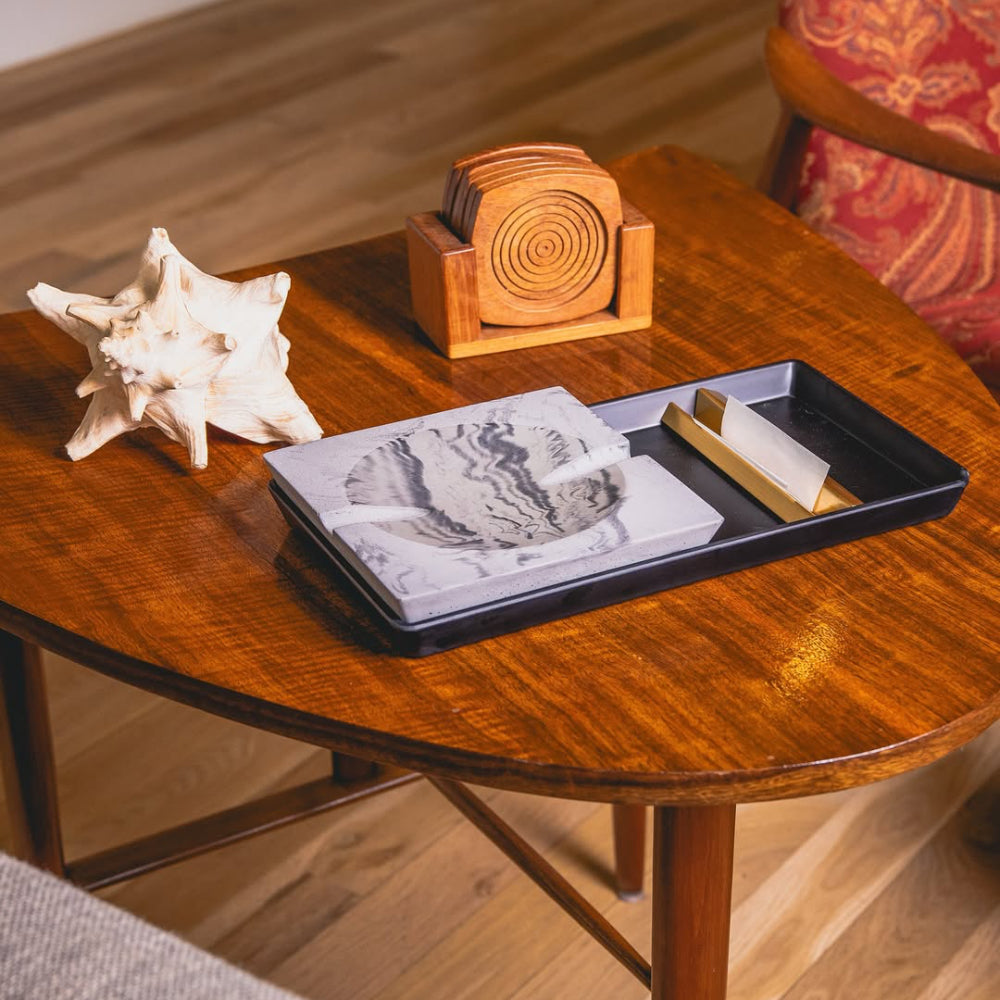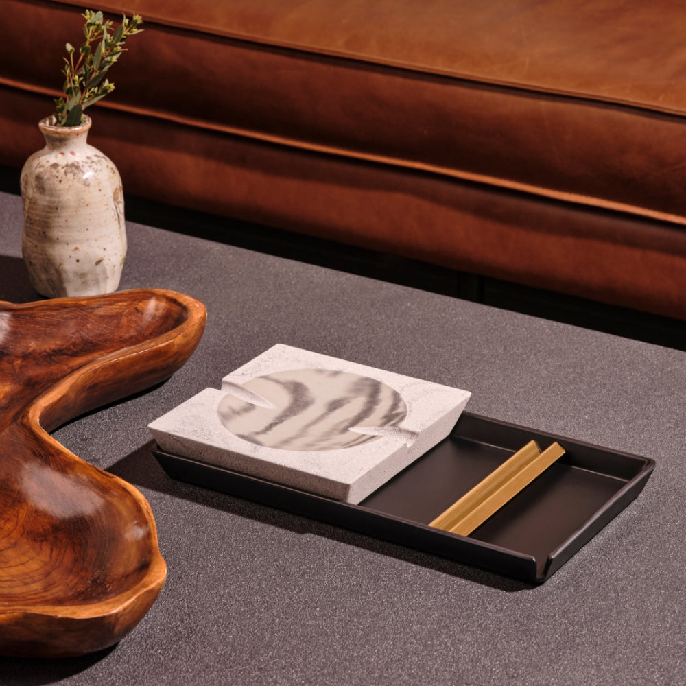 See premium suitsetamistarvikute komplekt sisaldab käsitsi valatud marmorbetoonist tuhatoosi, stiilset melamiinist