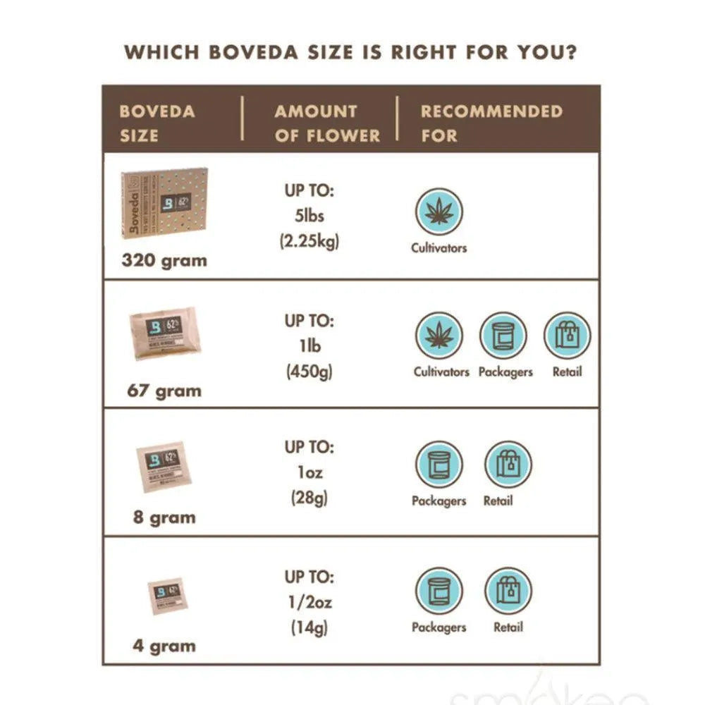 Boveda suurus 4 on ideaalne väikeste konteinerite, väikeste kottide ja eeltäidetud purkide jaoks. Kas teil on rohkem? Boveda on saadaval igas konteineri suuruses ja hoiustamise etapis. Kogege ise, kui palju parem see on koos Boveda. Lihtsalt asetage Boveda oma konteinerisse koos ürtidega ja sulgege kaas. See ongi nii lihtne.