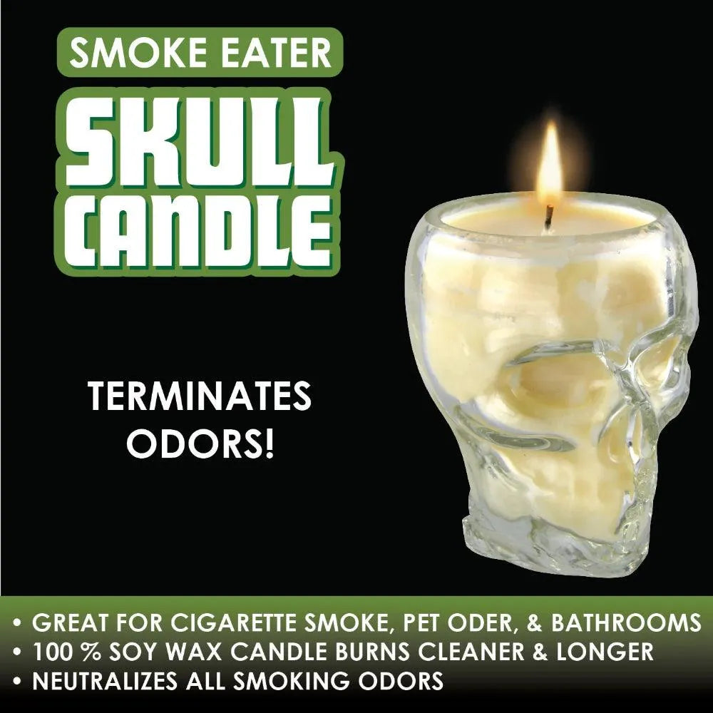 Эти свечи-черепы для пожирателей дыма от Smokezilla устраняют запахи от домашних животных, туалетов, дыма и т. д. Изготовленные из 100% соевого воска, эти свечи поставляются в стеклянных банках в форме черепа разных цветов. Высота свечей составляет 3 дюйма (7,6 см).