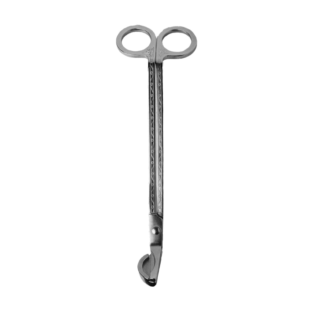 Scissors struggle inside jars and can leave uneven cuts. A stainless steel candle wick trimmer uses an angled cutting head for a precise trim, plus a wick catcher to reduce mess and keep wax cleaner.
